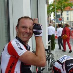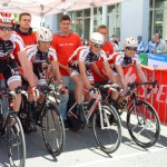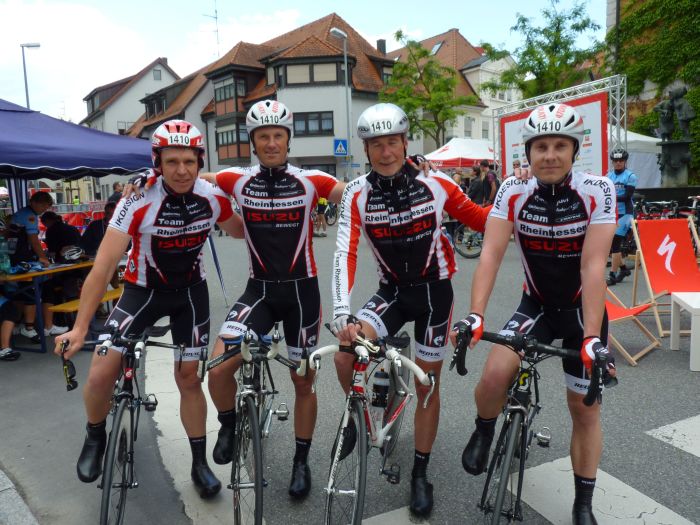 Tino, Reinhard, Falk und ich standen dann bei besten äußeren Bedingungen am Start der hügeligen und kurvenreichen 40km. Wir starteten zügig und holten schon nach wenigen Kilometern die beiden vor uns gestarteten Mannschaften ein. Läuft doch prima, dachte ich da schon. Bei Kilometer 10 hatte Reinhard dann einen Platten, Mist, da waren wir nur noch zu dritt. Denn Materialwagen sind nicht zugelassen gewesen. So drückte ich mit Falk gemeinsam auf’s Tempo. Tino hatte vor allem an den Anstiegen und in den Kurven ein wenig Probleme, er quälte sich aber sehr und drückte dann wieder in der Ebene auf’s Tempo. So kamen wir dann sogar mit der besten Zeit ins Ziel der bisher gestarteten Mannschaften. Ok, wir sind auch als 6. Mannschaft gestartet. Wir hielten auch nicht lang die Bestzeit. Am Ende waren wir auf einem akzeptablen 21. Platz.